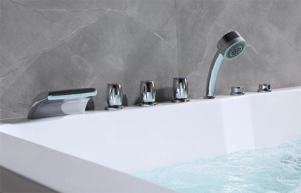 With the chrome polished drain, waterfall faucet, knobs, 45" length showerhead, pillow, and jets. The whirlpool tub accessories are pre-drilled and pre-installed. Perfect for any age, and any gender to enjoy SPA-Like comfort in your own home.
